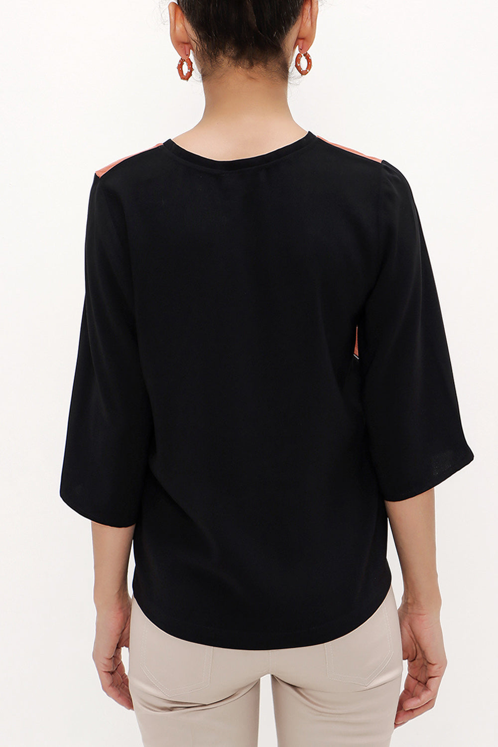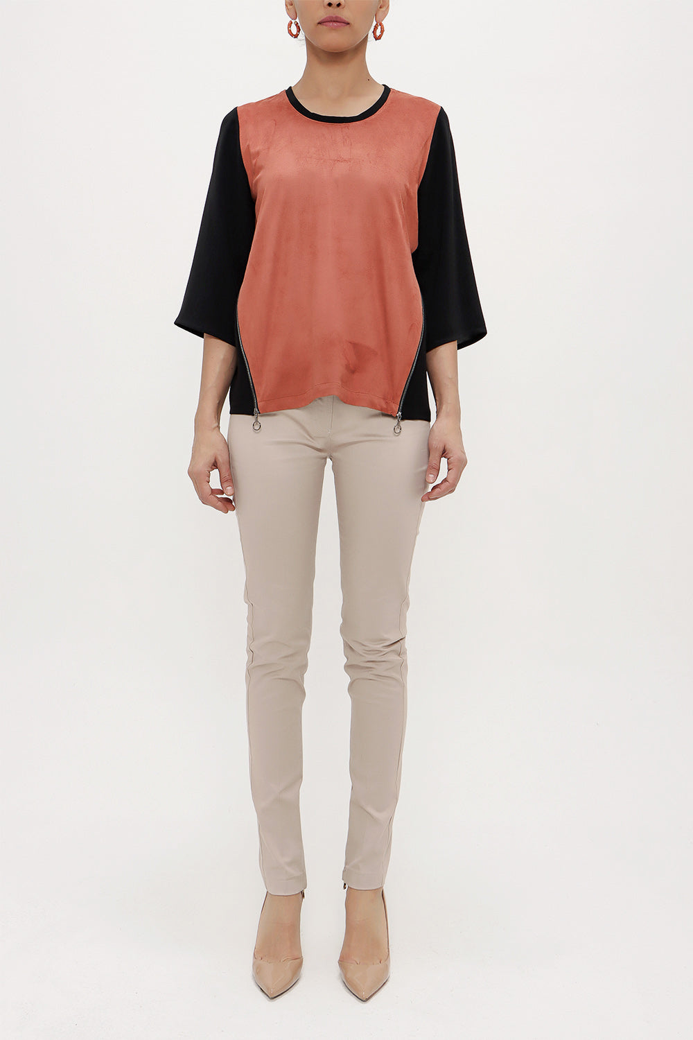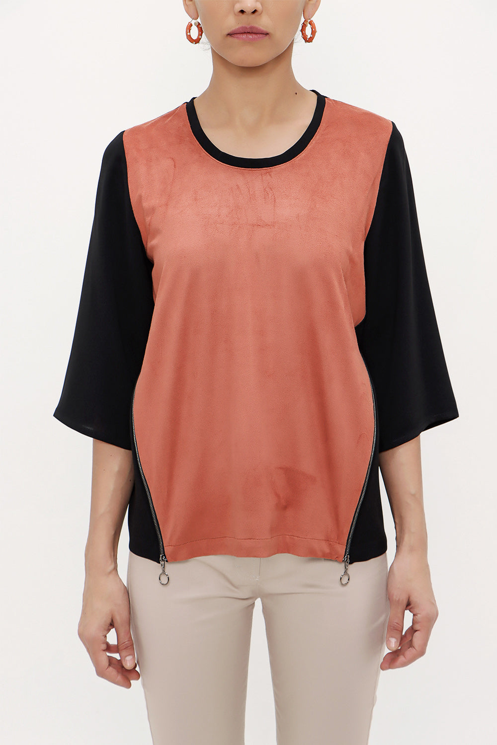 Siyah Taba Süet mixli fermuar detaylı bluz 19399