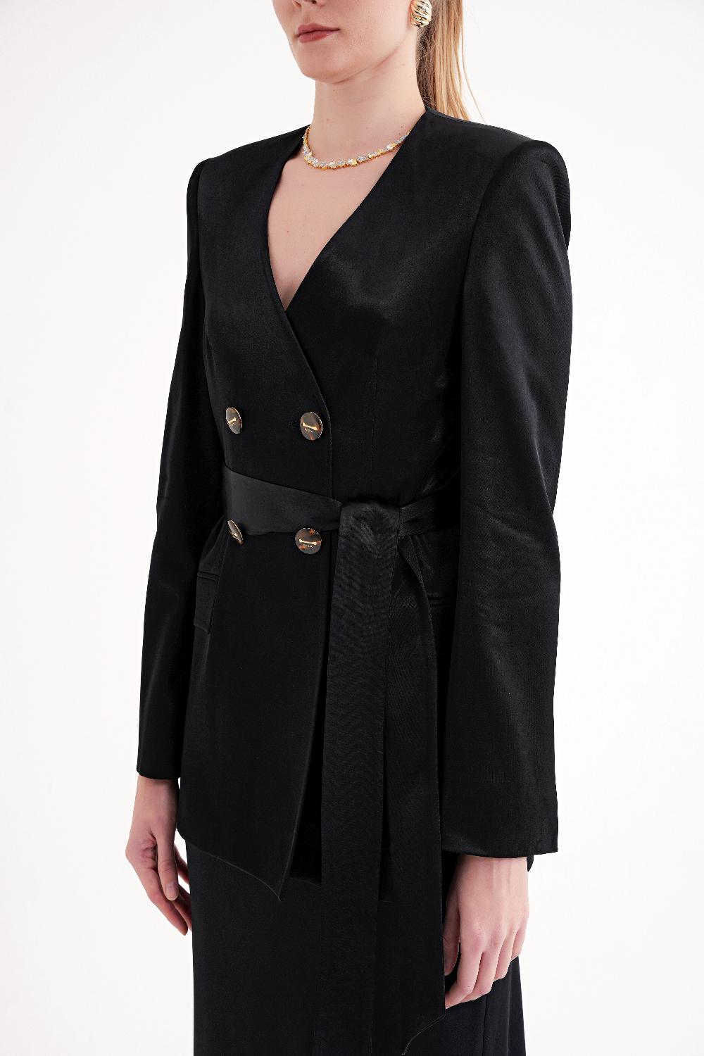 Ürün Özellikleri: Kruvaze yaka detayı ve zarif dikiş hatlarıyla modern bir siluet sunan bu ceket, güçlü ve sofistike bir duruş sergiler. Akıcı kumaşı ve kemer detayıyla hem şık hem konforlu bir görünüm sağlar.