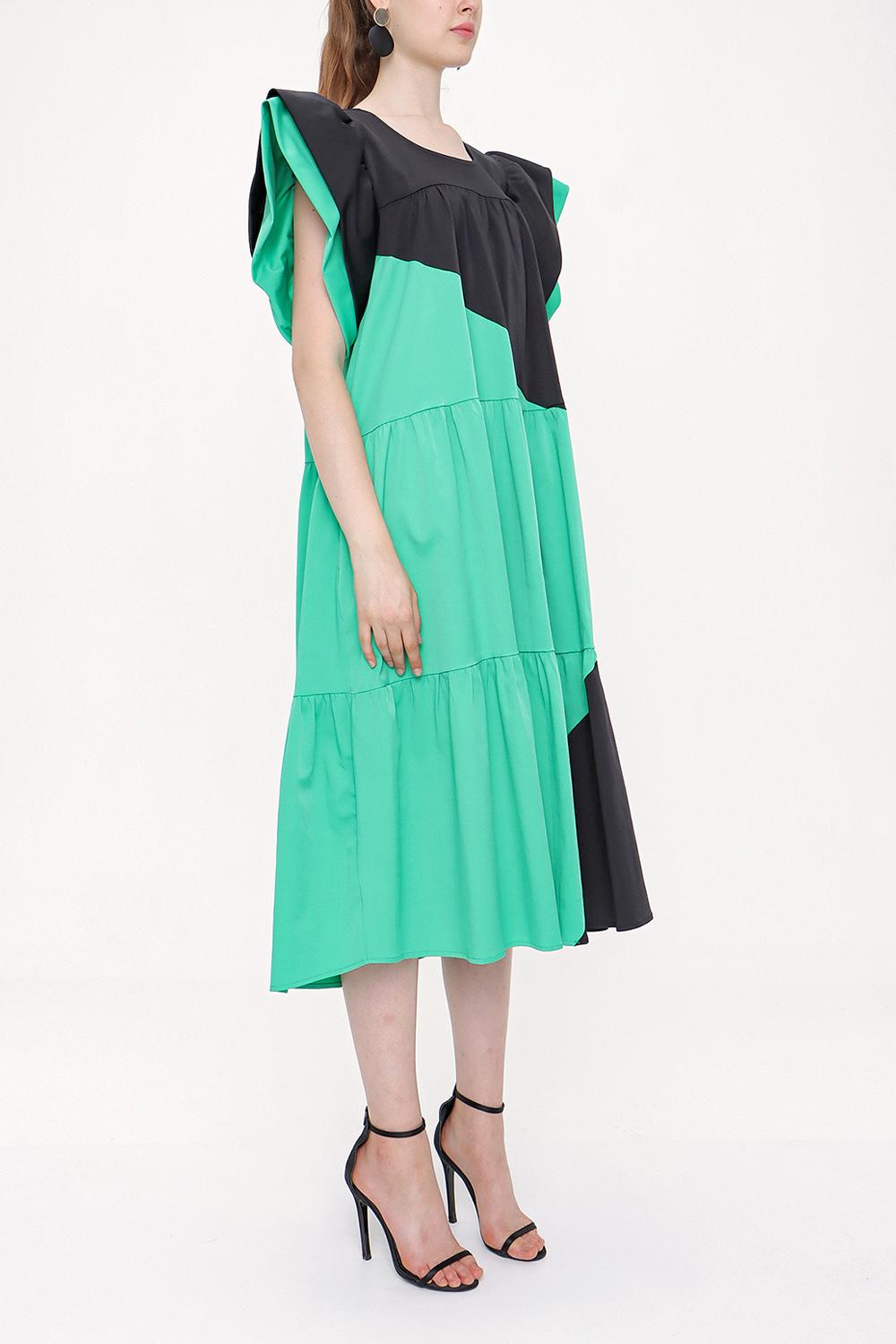 Siyah Yeşil Kontrast renkli büzgülü elbise 93944
