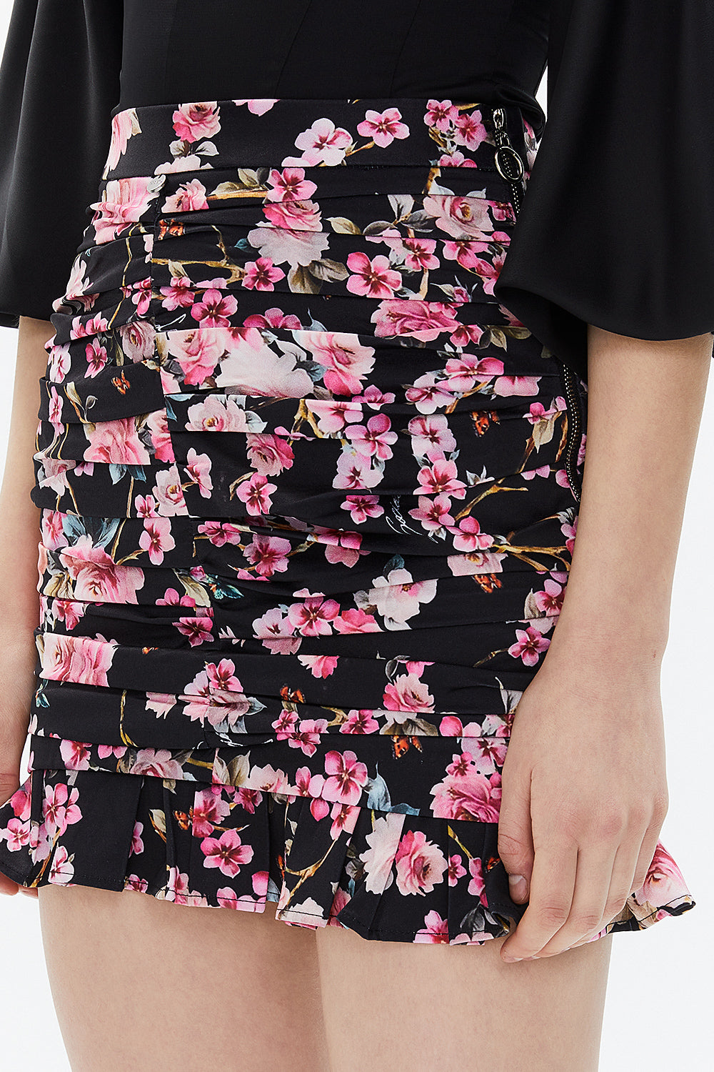 Siyah Zemin Çiçek Baskılı Büzgülü dar kesim midi etek 81123