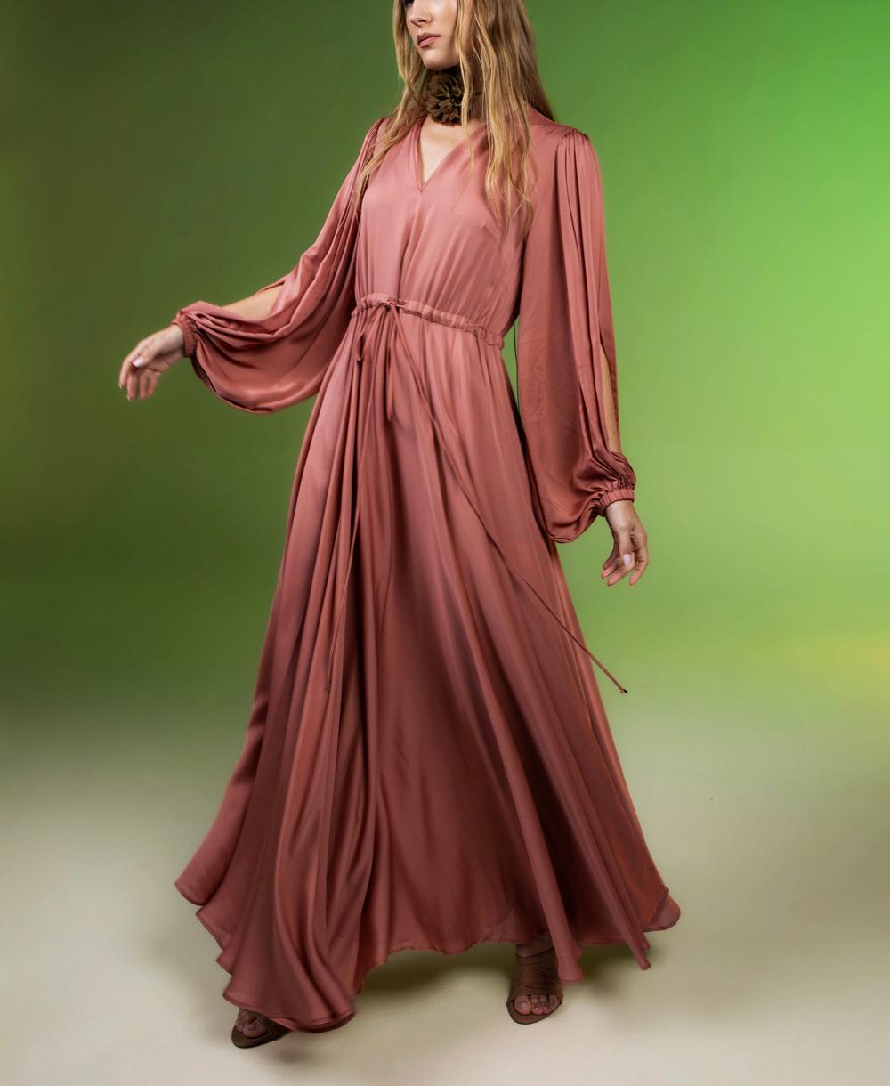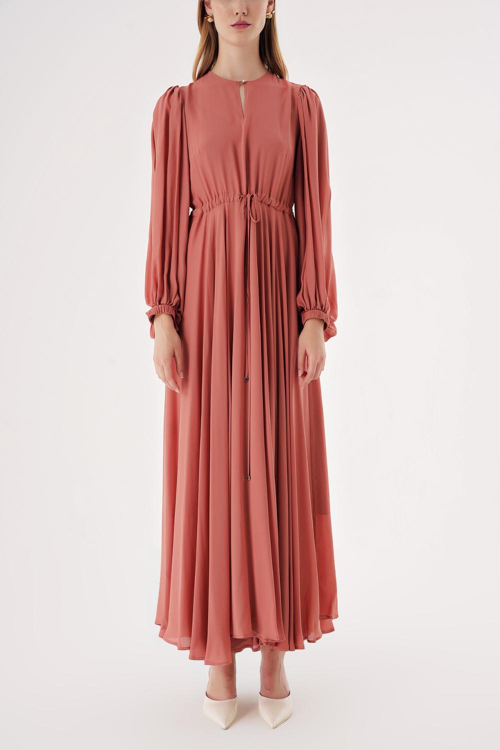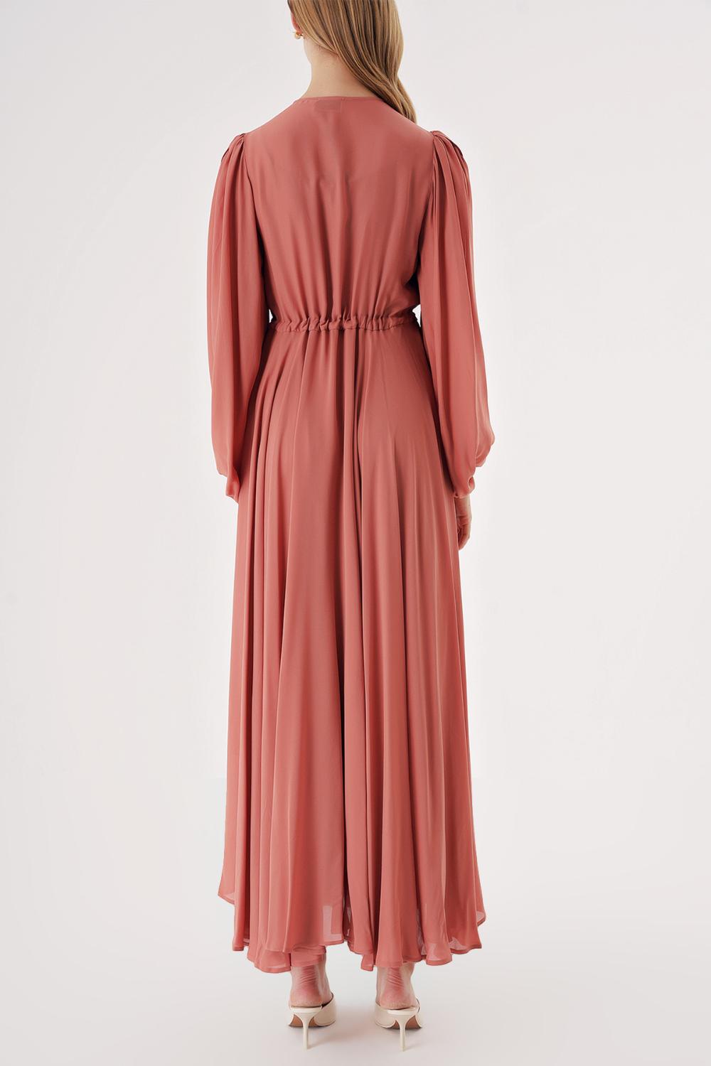 Somon Kolu yırtmaçlı, bağçıklı uzun elbise 94463