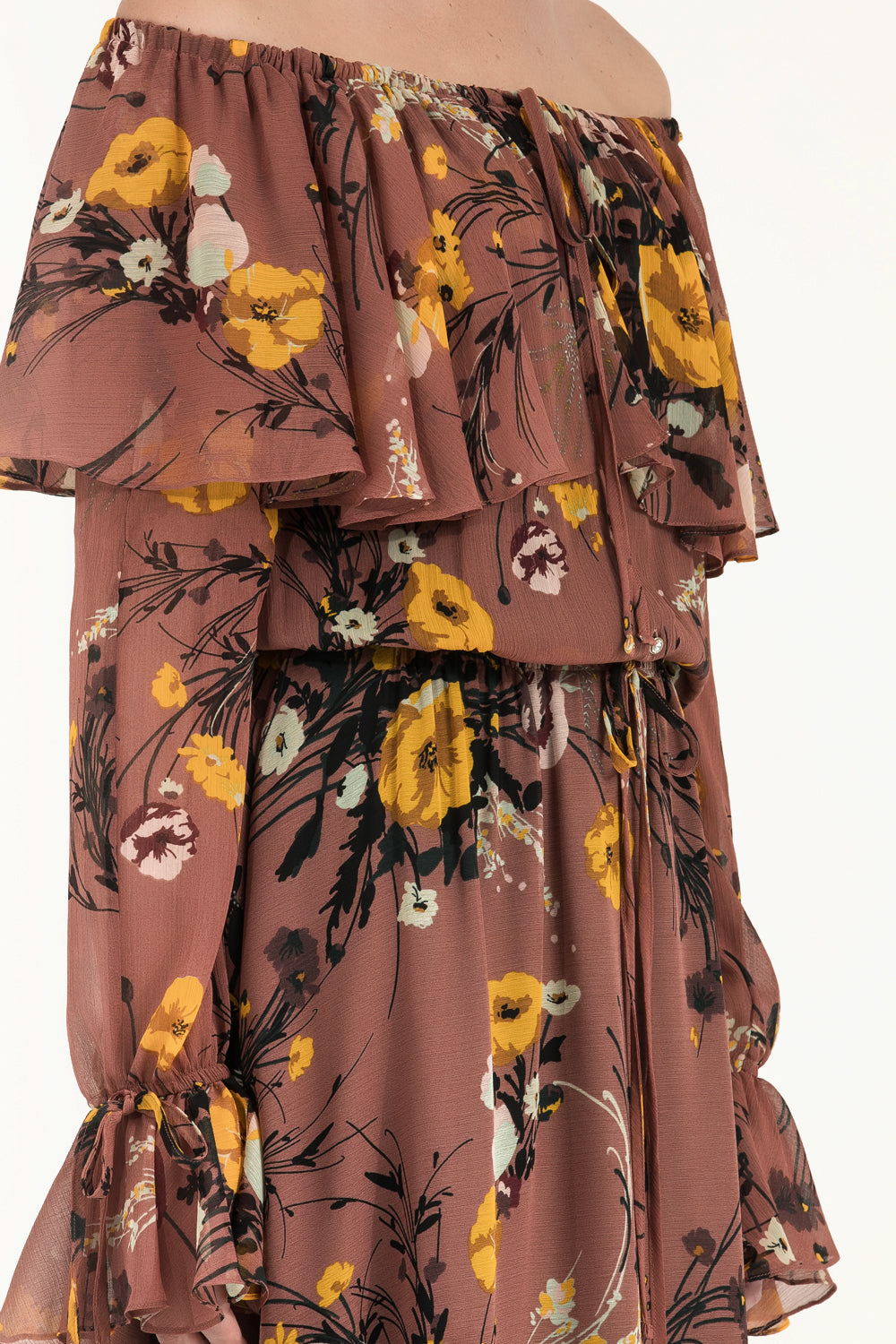 Somon Volanlı düşük omuz şifon uzun elbise 92303