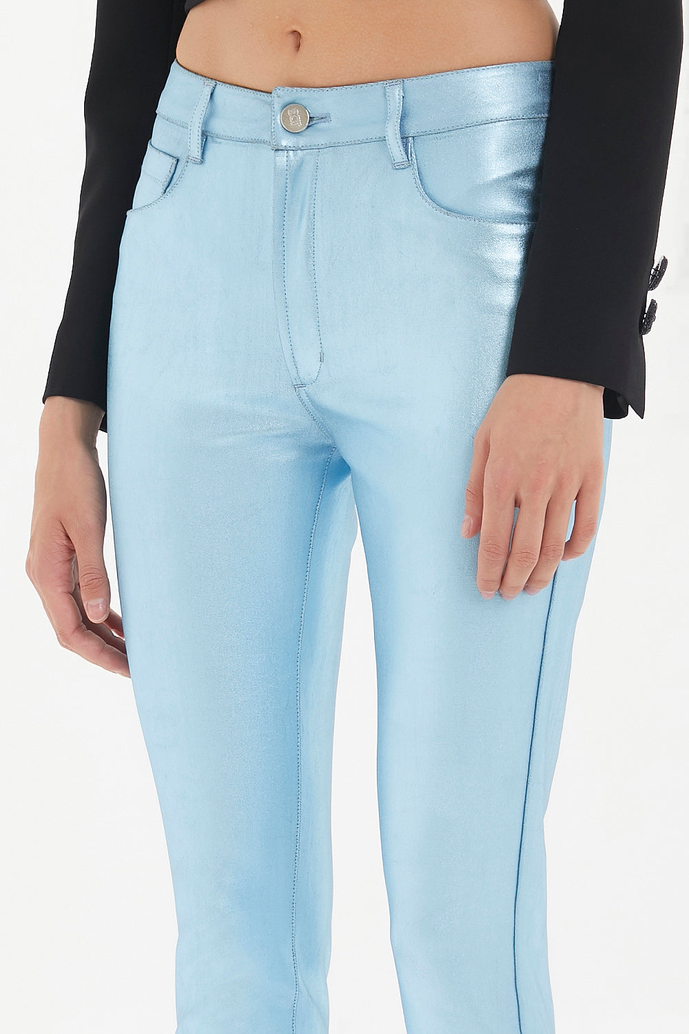Turkuaz Parlak kumaş dar kesim cep pantolon 41310