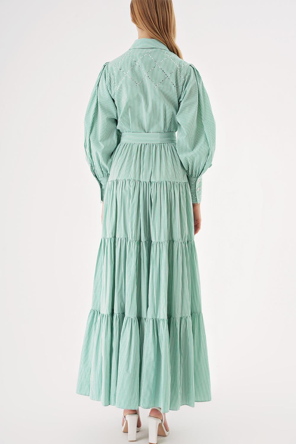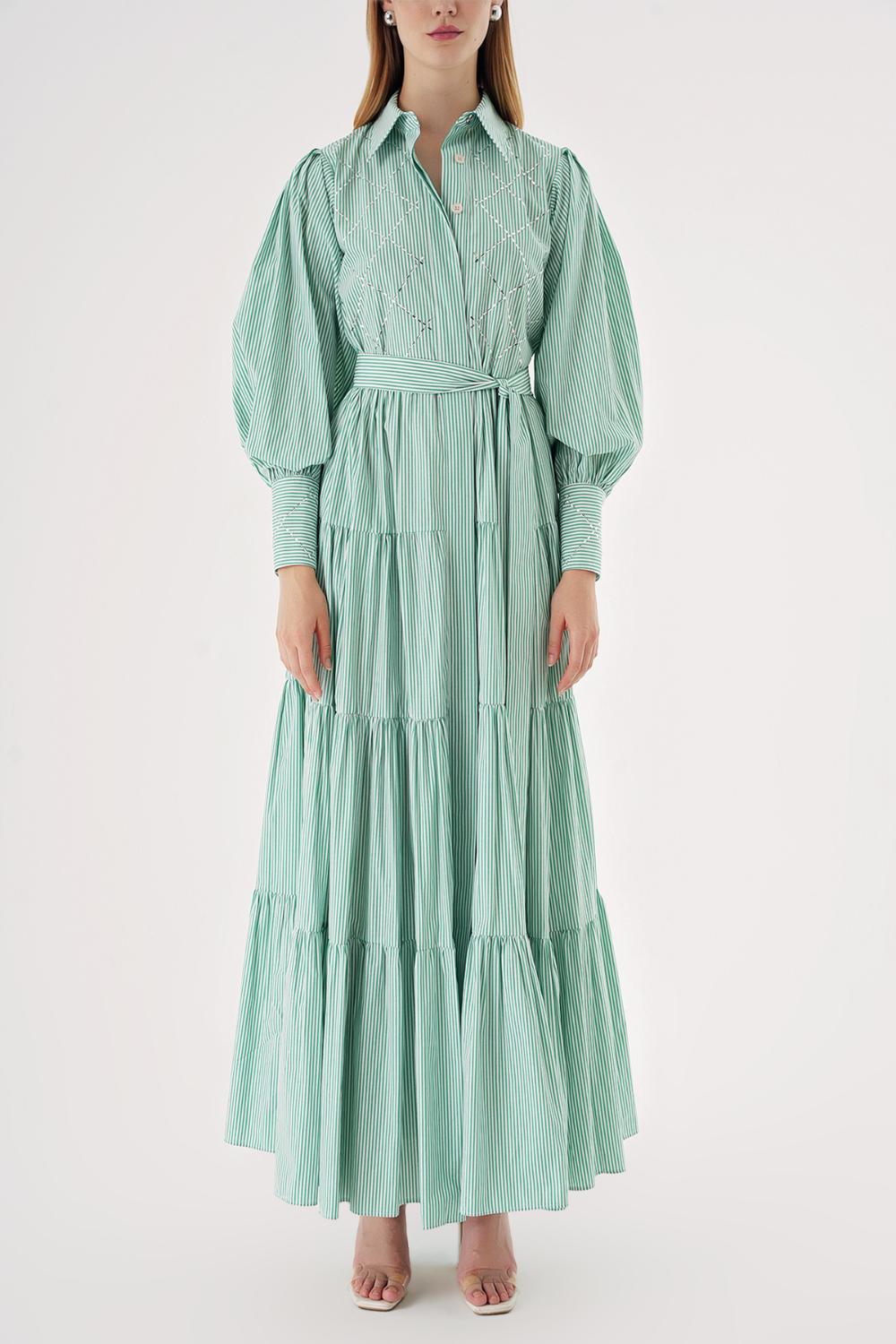 Yeşil Balon kol büzgülü kristal taş detaylı gömlek elbise 94546