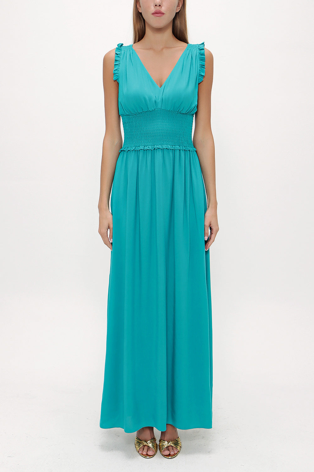 Yeşil Beli lastikli V yaka kolsuz uzun elbise 93348