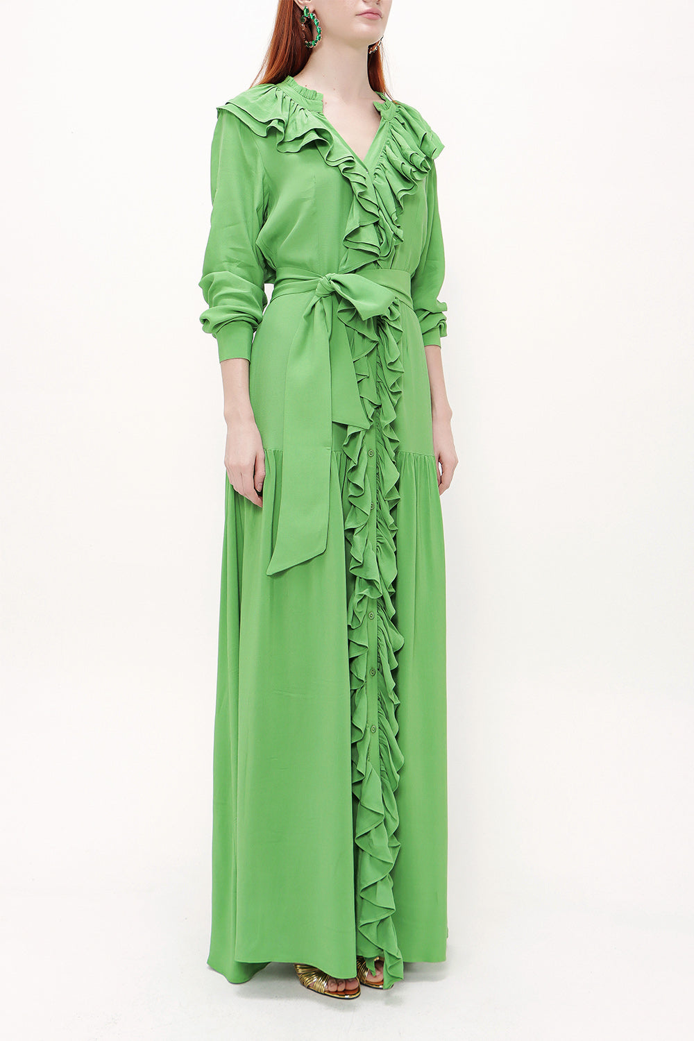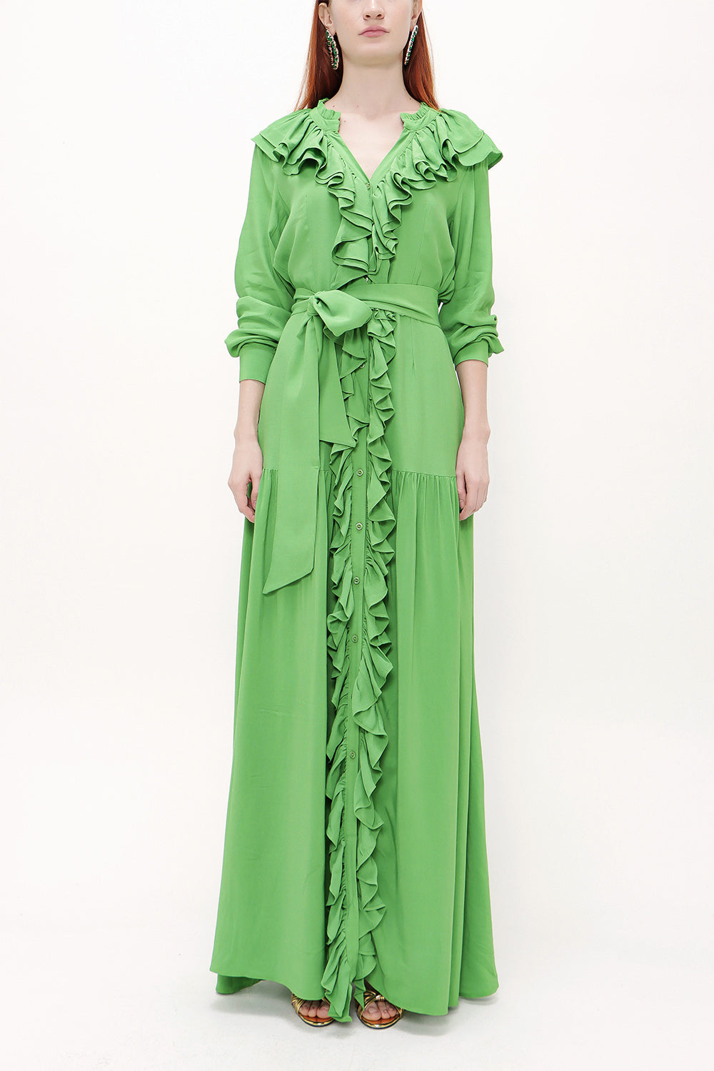 Yeşil Fırfırlı beli lastikli uzun elbise 93262