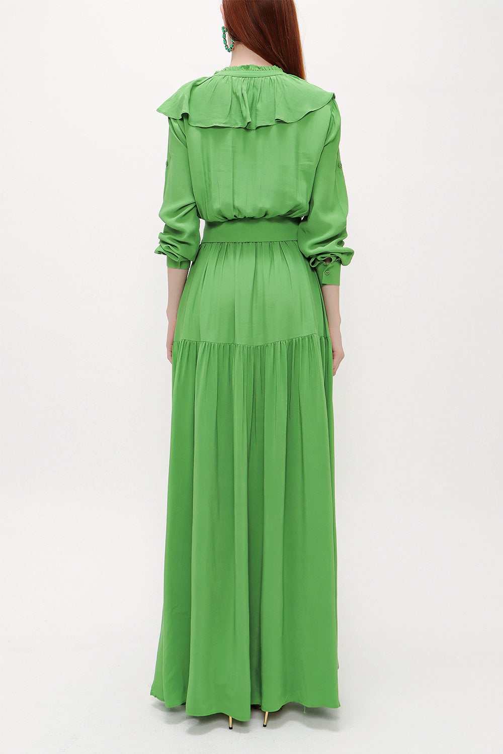Yeşil Fırfırlı beli lastikli uzun elbise 93262